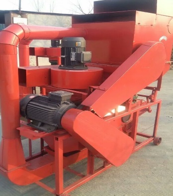 3、花生粒及破碎的花生殼在轉子的旋轉風壓及打擊下,通過一定孔徑的篩網(花生第一次脫粒用大孔篩網,清選后的小皮果更換成小孔篩網進行第二次脫殼),這時,花生殼、粒受到旋轉風扇的吹力作用,重量輕的花生殼被吹出機體外。